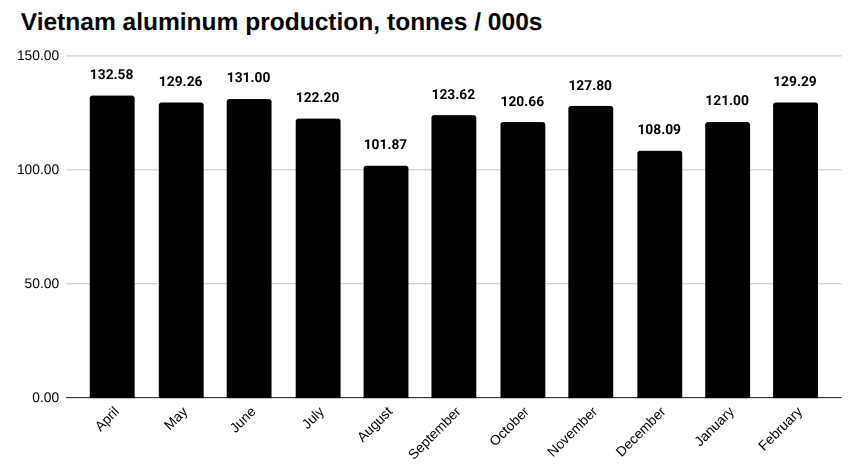 ToggleVietnam produced 129.29 thousand tonnes of aluminum in February, up 6.85 percent from 121.00 thousand tonnes in January, according to the latest data from the National Statistics Office.
