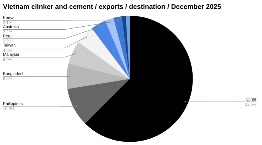 Rounding out the top five was Peru constituting US$5 million worth of Vietnam’s clinker and cement exports in December. This was up from US$2 million in clinker and cement exports in November, a change of 110.09 percent. Year to date, Vietnam has shipped US$22 million worth of clinker and cement to Peru.
