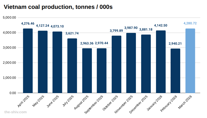 ToggleVietnam produced 4,280.72 thousand tonnes of coal in March, up 45.59 percent from 2,940.21 thousand tonnes in February 2026, according to the National Statistics Office.