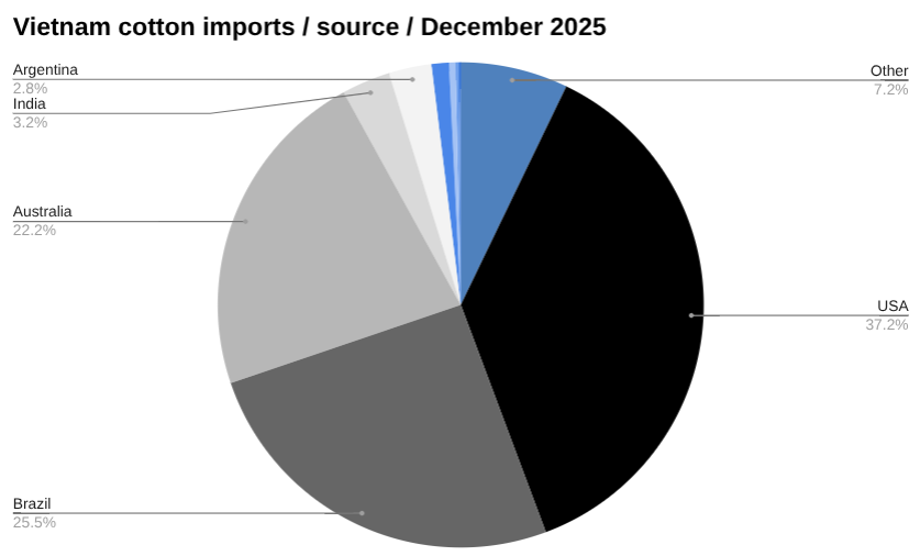 After the USA was Brazil making up US$66 million worth of Vietnam’s cotton imports in December. This was up from US$47 million in cotton imports in November, a change of 40.50 percent. Year to date, Brazil has shipped US$780 million worth of cotton to Vietnam.