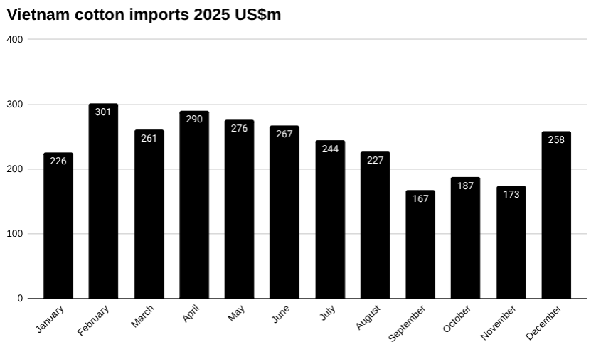 ToggleVietnam imported cotton to the tune of US$258 million in December, up from US$173 million in November, a change of 48.91 percent, according to preliminary data from Vietnam’s General Department of Customs.