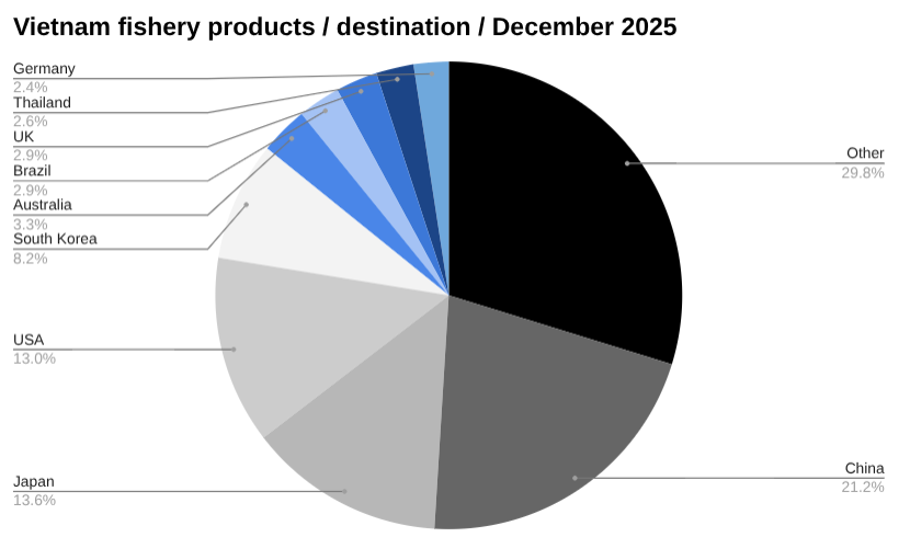 Following the USA was South Korea representing US$79 million worth of Vietnam’s fishery products exports in December. This was up from US$78 million in fishery products exports in November, a change of 0.15 percent. Year to date, Vietnam has shipped US$865 million worth of fishery products to South Korea.