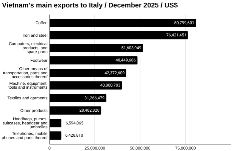 Vietnam exported US$80.80 million worth of coffee to Italy in December. This was up from US$33.93 million in November, a change of 138.16 percent.