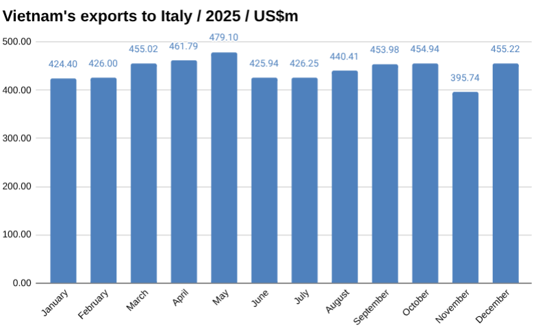In December, Vietnam exported US$455 million worth of goods to Italy, up 15.03 percent over November, according to preliminary data from Vietnam’s General Department of Customs.