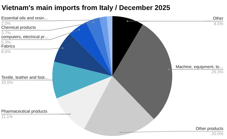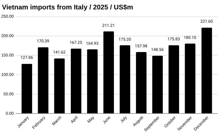 ToggleIn December, Vietnam imported US$221.60 million worth of goods from Italy, up from US$180.10 million in November, a change of 23.04 percent, according to preliminary data from Vietnam’s General Department of Customs.