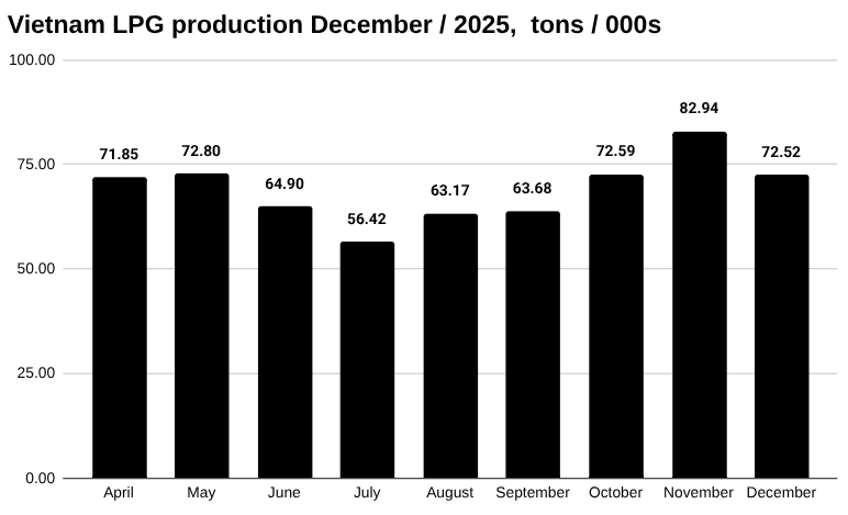 ToggleVietnam produced 72.52 thousand tons of liquefied petroleum gas (LPG) in December, down 12.56 percent from 82.94 thousand tons in November, according to the latest data from the National Statistics Office.