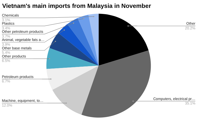 In November, Vietnam imported US$805.98 million worth of goods from Malaysia and exported US$472.55 million to Malaysia, for total trade worth US$1,278.53 million, and leaving a trade deficit of US$333.43 million.