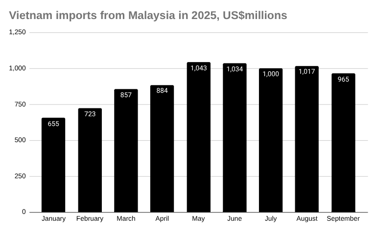 For the first nine months of 2025, computers and electronics accounted for over one-third of Vietnam’s total imports from Malaysia.