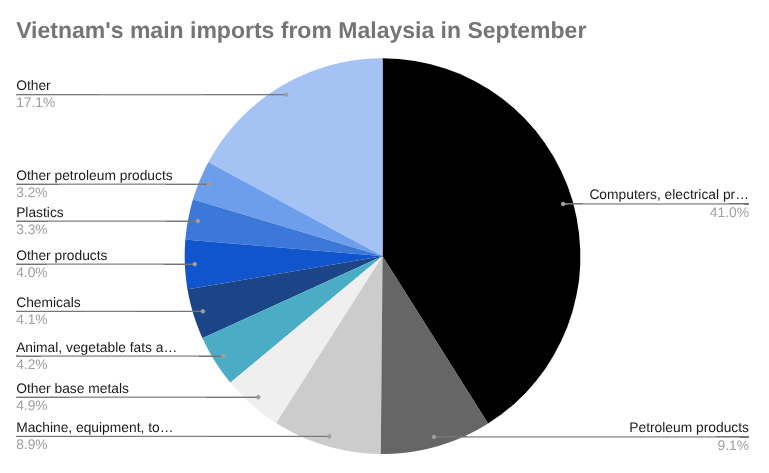 Computers, electrical products, and components remained Vietnam’s largest import group from Malaysia at US$396.29 million, down 8.33 percent from August.