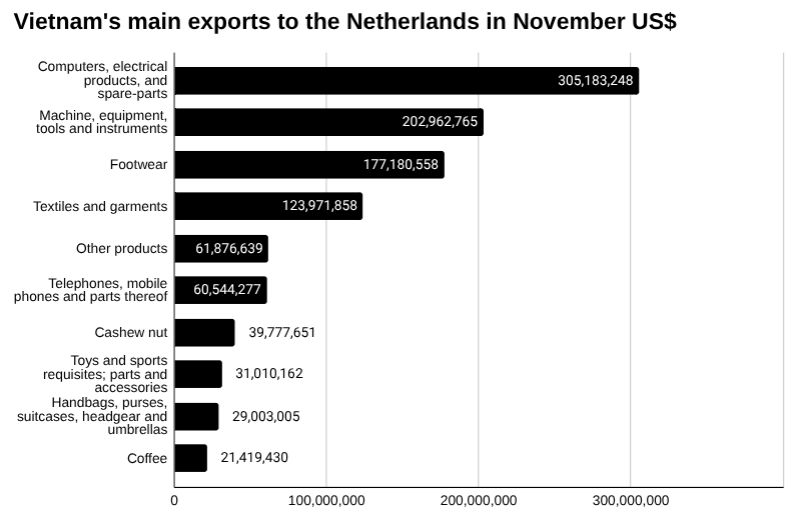 In November, Vietnam imported US$60.83 million worth of goods from Netherlands and exported US$1,165.41 million to Netherlands, for total trade worth US$1,226.23 million, and leaving a trade surplus of US$1,104.58 million.