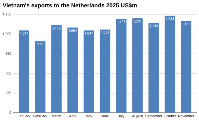 So far this year, Vietnam has exported US$12,190 million worth of goods to the Netherlands.