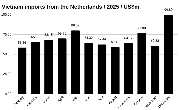 In December, Vietnam imported US$99.80 million worth of goods from Netherlands, up from US$60.83 million in November, a change of 64.08 percent, according to preliminary data from Vietnam’s General Department of Customs.