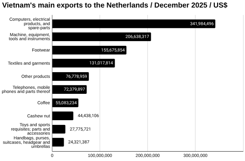 Vietnam exported US$341.98 million worth of computers, electrical products, and spare-parts to the Netherlands in December. This was up from US$305.18 million in November, a change of 12.06 percent.