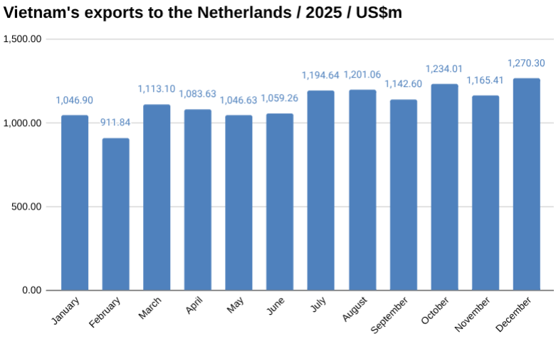 In December, Vietnam imported goods worth US$99.80 million from Netherlands and exported US$1,270.30 million, bringing total trade to US$1,370.10 million and resulting in a trade surplus of US$1,170.50 million.