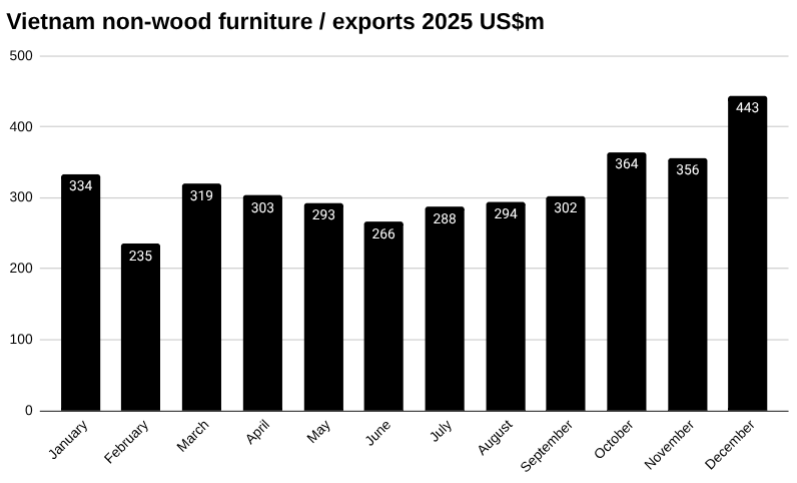 Year to date, Vietnam had exported US$3,829 million worth of non-wood furniture by the end of December.