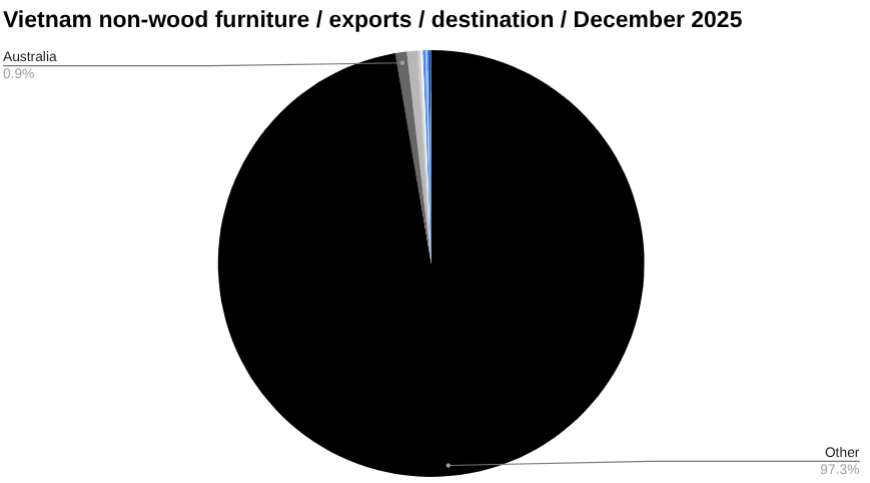 Australia accounted for US$4 million worth of Vietnam’s non-wood furniture exports in December. This was up from US$3 million in non-wood furniture exports in November, a change of 43.26 percent. Year to date, Vietnam has shipped US$43 million worth of non-wood furniture to Australia.
