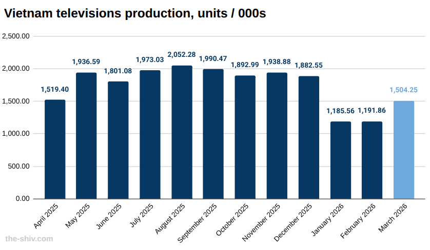 ToggleVietnam produced 1,504.25 thousand units of televisions in March, up 26.21 percent from 1,191.86 thousand units in February 2026, according to the latest data from the National Statistics Office.