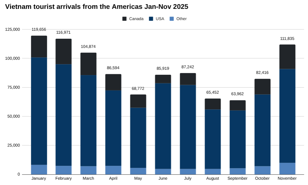 ToggleIn November, the Americas accounted for 111,835 tourist arrivals, an increase of 35.70 percent from October, according to the latest data from Vietnam’s General Department of Tourism.