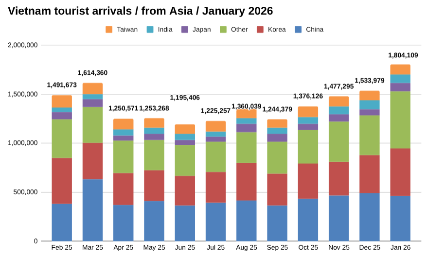 ToggleIn January, Asia accounted for 1,804,109 tourist arrivals in Vietnam, an increase of 17.60 percent from December, according to the latest data from Vietnam’s General Department of Tourism.