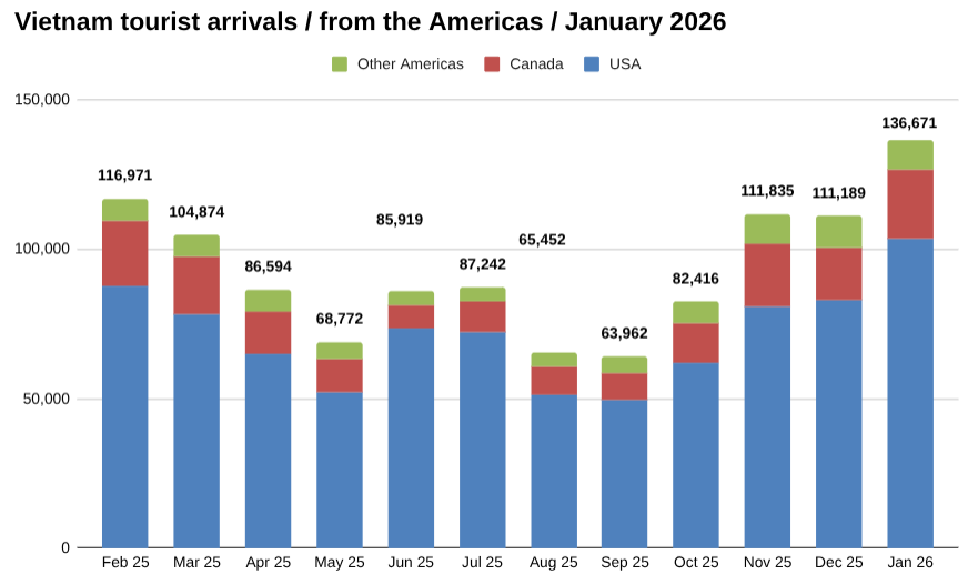 ToggleIn January, Americas accounted for 136,671 tourist arrivals, an increase of 22.90 percent from December, according to the latest data from Vietnam’s General Department of Tourism.