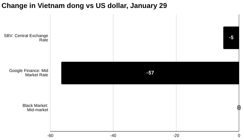 ToggleOn January 29, in Vietnam, the black market US dollar buy rate was VND 26,200, and the sell rate was VND 26,250, a change of 0 and 0, respectively, for a mid-market rate of VND 26,225, according to prices quoted by Ty Gia USD.