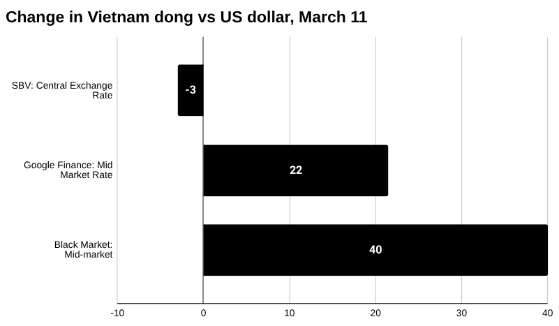 ToggleOn March 11, in Vietnam, the black market US dollar buy rate was VND 27,190, and the sell rate was VND 27,240, a change of 40 and 40, respectively, for a mid-market rate of VND 27,215 (up 0.15 percent), according to prices quoted by Ty Gia USD.