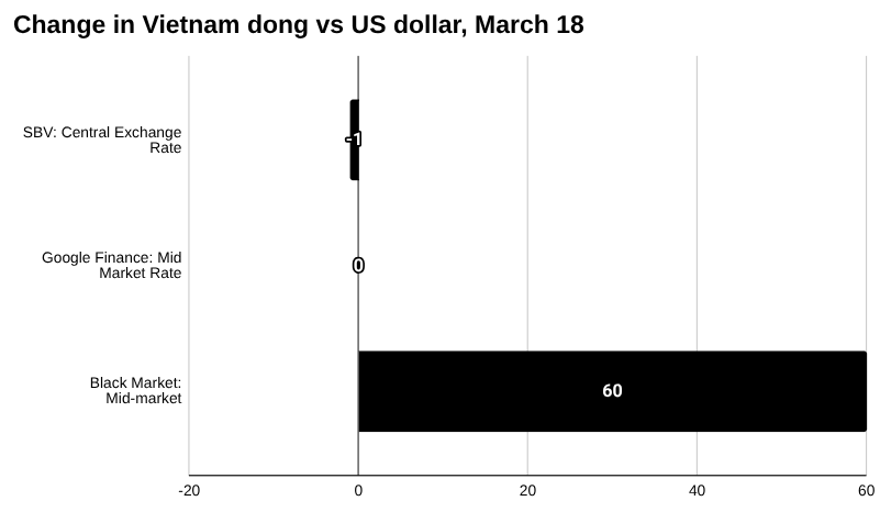 ToggleOn March 18, in Vietnam, the black market US dollar buy rate was VND 27,400, and the sell rate was VND 27,450, a change of 60 and 60, respectively, for a mid-market rate of VND 27,425 (up 0.22 percent), according to prices quoted by Ty Gia USD.