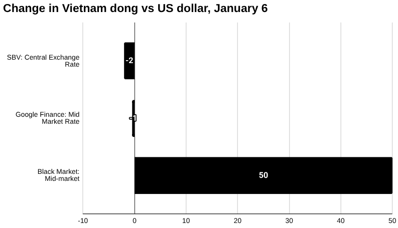 ToggleOn January 6, in Vietnam, the black market US dollar buy rate was VND 26,950 and the sell rate was VND 27,000, a change of 50 and 50, respectively, for a mid-market rate of VND 26,975 (up 0.19 percent), according to Ty Gia USD.