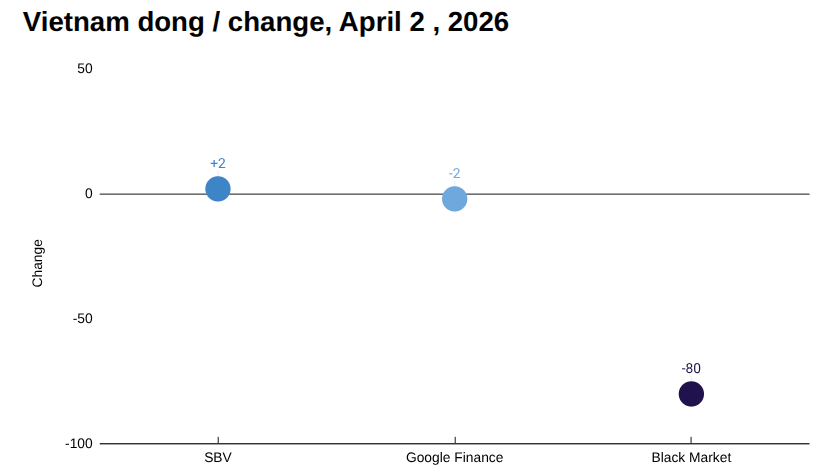 ToggleOn April 2, in Vietnam, the black market US dollar buy rate was VND 27,420, and the sell rate was VND 27,470, a change of 80 and 80, respectively, for a mid-market rate of VND 27,445 (down 0.29 percent), according to prices quoted by Ty Gia USD.