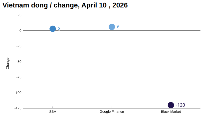 ToggleOn April 10, in Vietnam, the black market US dollar buy rate was VND 26,800, and the sell rate was VND 26,830, a change of 110 and 130, respectively, for a mid-market rate of VND 26,815 (down 0.45 percent), according to prices quoted by Ty Gia USD.