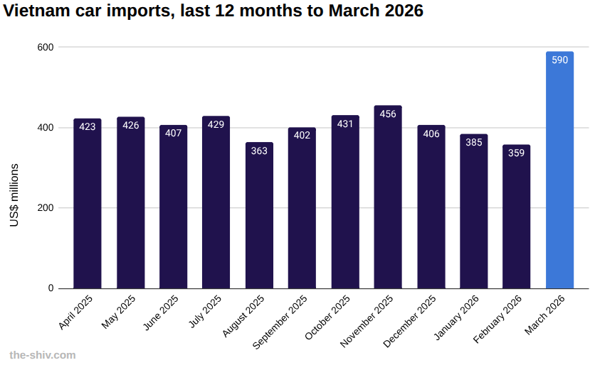 Vietnam imports of car in March, 2026 US$m