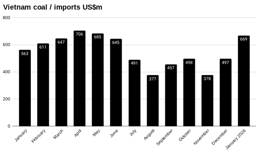 Year to date, Vietnam had imported US$669 million worth of coal by the end of January.
