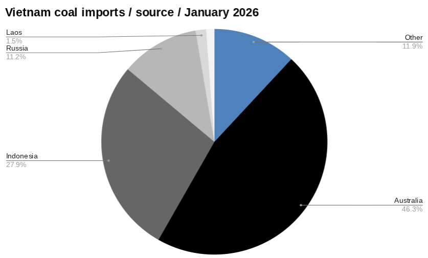 Australia accounted for US$310 million worth of Vietnam’s coal imports in January. This was up from US$182 million in coal imports in December, a change of 70.64 percent. Year to date, Australia has shipped US$310 million worth of coal to Vietnam.