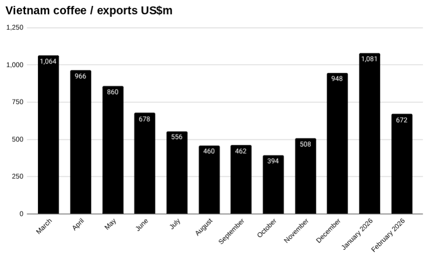 ToggleVietnam exported coffee to the tune of US$672 million in February, down from US$1,081 million in January, a change of -37.89 percent, according to preliminary data from Vietnam’s General Department of Customs.