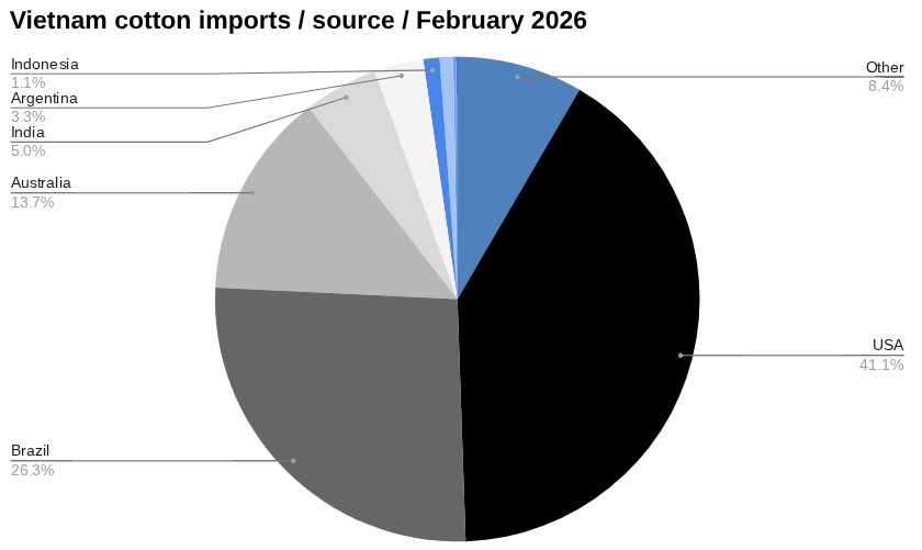 Brazil followed with US$43 million in February, down from US$65 million in January, a change of 34.24 percent. Year to date, Brazil has shipped US$108 million worth of cotton to Vietnam.