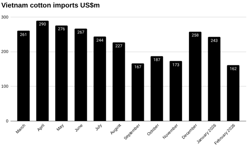 Year to date, Vietnam had imported US$405 million worth of cotton by the end of February.