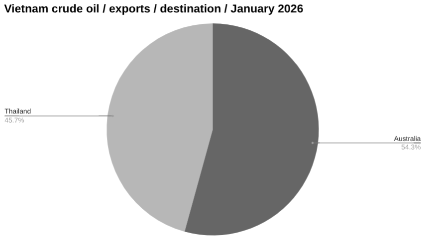 After Australia was Thailand making up US$19 million worth of Vietnam’s crude oil exports in January. This was down from US$22 million in crude oil exports in December, a change of -14.65 percent. Year to date, Vietnam has shipped US$19 million worth of crude oil to Thailand.