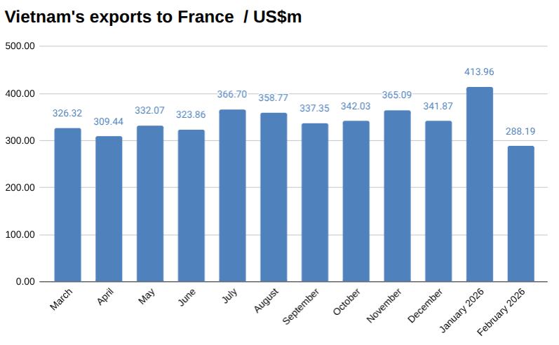 Vietnam exports to France in February 2026 US$m