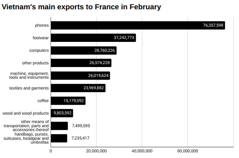 ToggleIn February, Vietnam exported US$288 million worth of goods to France, down 30.38 percent over January, according to preliminary data from Vietnam’s General Department of Customs.