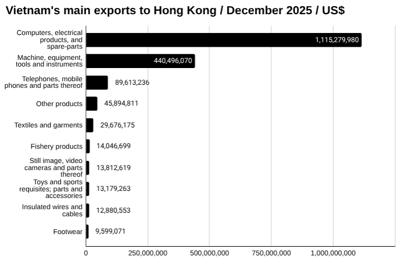 Vietnam exported US$1,115.28 million worth of computers, electrical products, and spare parts to Hong Kong in December. This was up from US$880.63 million in November, a change of 26.65 percent.