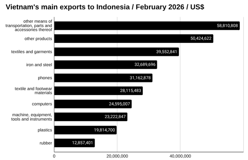 Vietnam exported US$58.81 million worth of other means of transportation, parts and accessories thereof to Indonesia in February, up from US$18.77 million in January, a change of 213.28 percent.