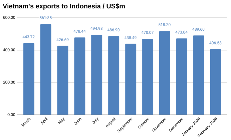 In February, Vietnam imported goods worth US$885.33 million from Indonesia and exported US$406.53 million, bringing total trade to US$1,291.86 million and resulting in a trade deficit of US$478.80 million.