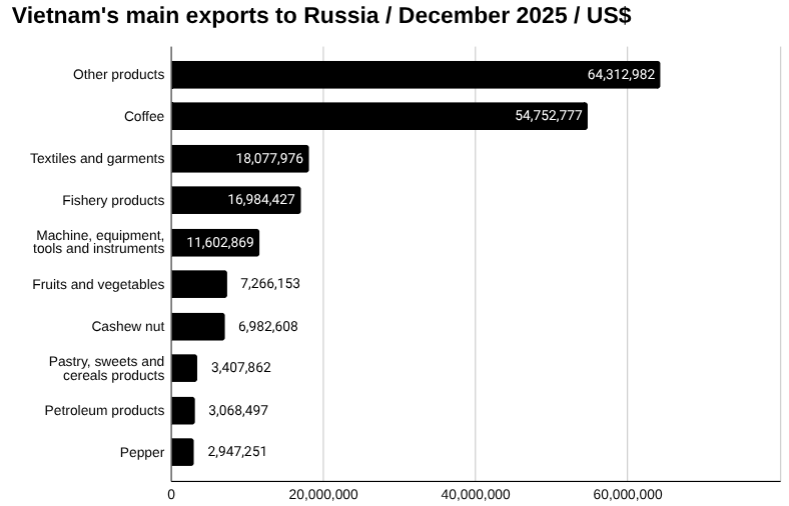 Vietnam exported US$54.75 million worth of coffee to Russia in December. This was up from US$35.97 million in November, a change of 52.20 percent.