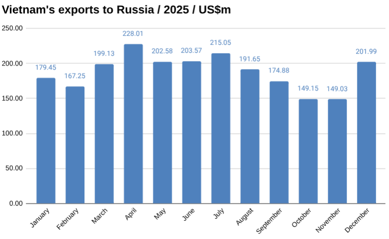 In December, Vietnam imported goods worth US$260.95 million from Russia and exported US$201.99 million, bringing total trade to US$462.94 million and resulting in a trade deficit of US$58.95 million.