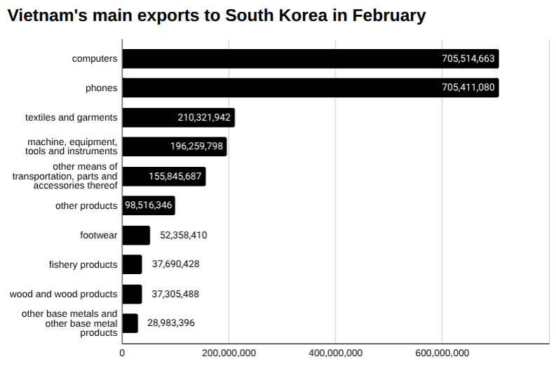 Vietnam exported US$705.51 million worth of computers to South Korea in February, down from US$878.42 million in January, a change of 19.68 percent.