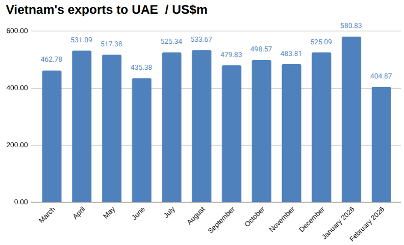 ToggleIn February, Vietnam exported US$405 million worth of goods to the UAE, down 30.30 percent from January, according to preliminary data from Vietnam’s General Department of Customs.