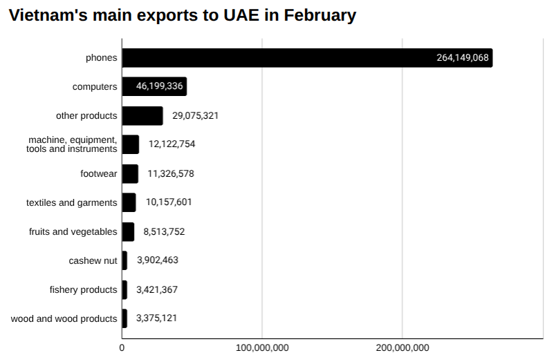 Vietnam exported US$264.15 million worth of phones to the UAE in February, down from US$329.99 million in January, a change of 19.95 percent.