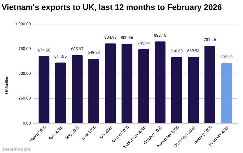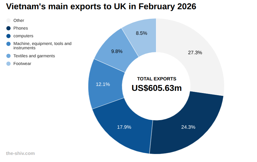 In February, Vietnam imported US$74.11 million worth of goods from UK and exported US$605.63 million to UK, for total trade worth US$679.74 million, and leaving a trade surplus of US$531.53 million.