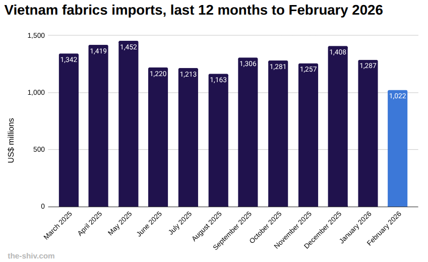 ToggleVietnam imported fabrics to the tune of US$1,022 million in February, down from US$1,287 million in January, a change of -20.59 percent, according to preliminary data from Vietnam’s General Department of Customs.