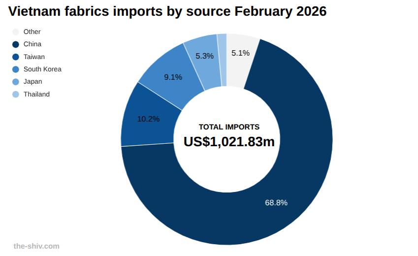 China accounted for US$703 million of Vietnam’s fabric imports in February, down from US$903 million in January, a fall of 22.06 percent.